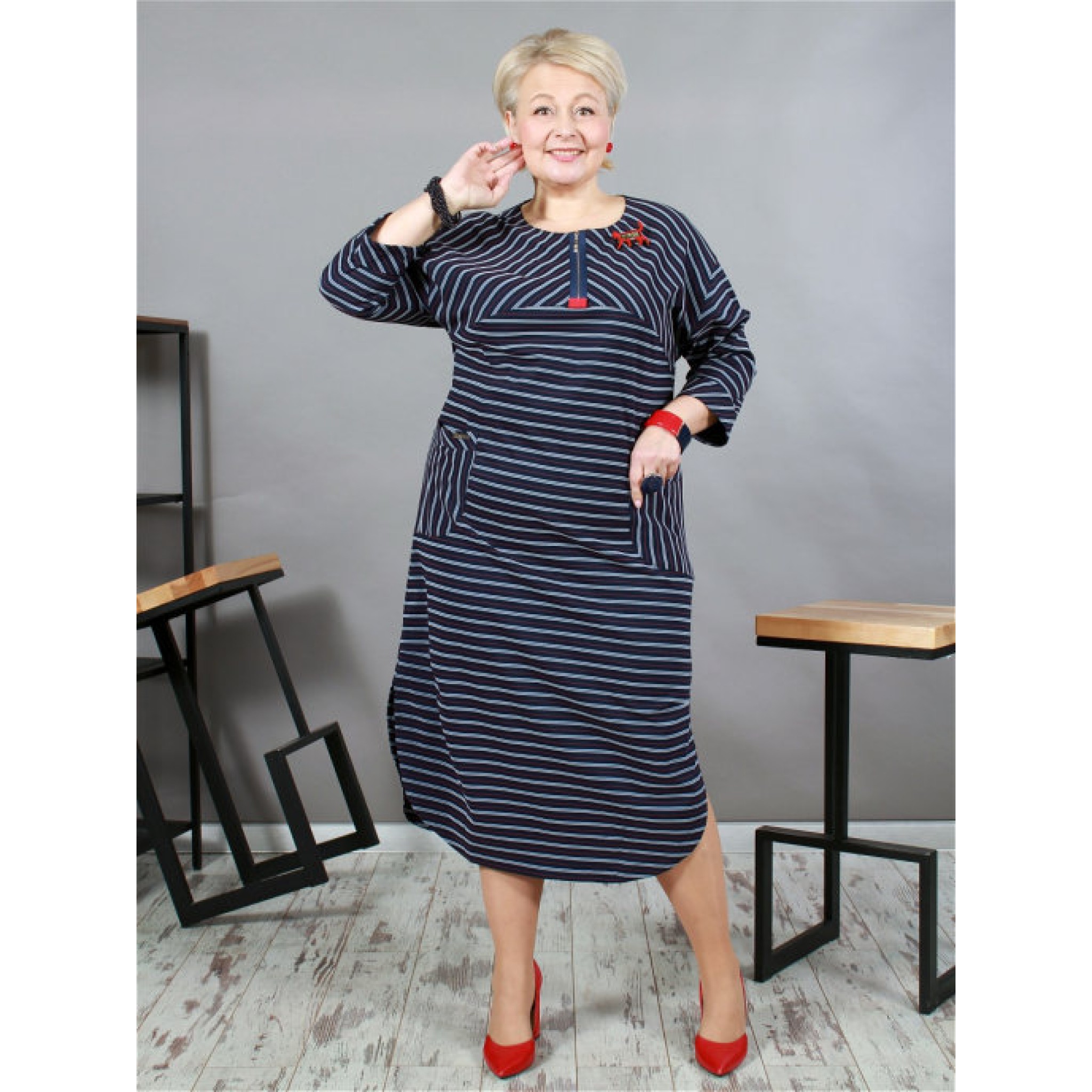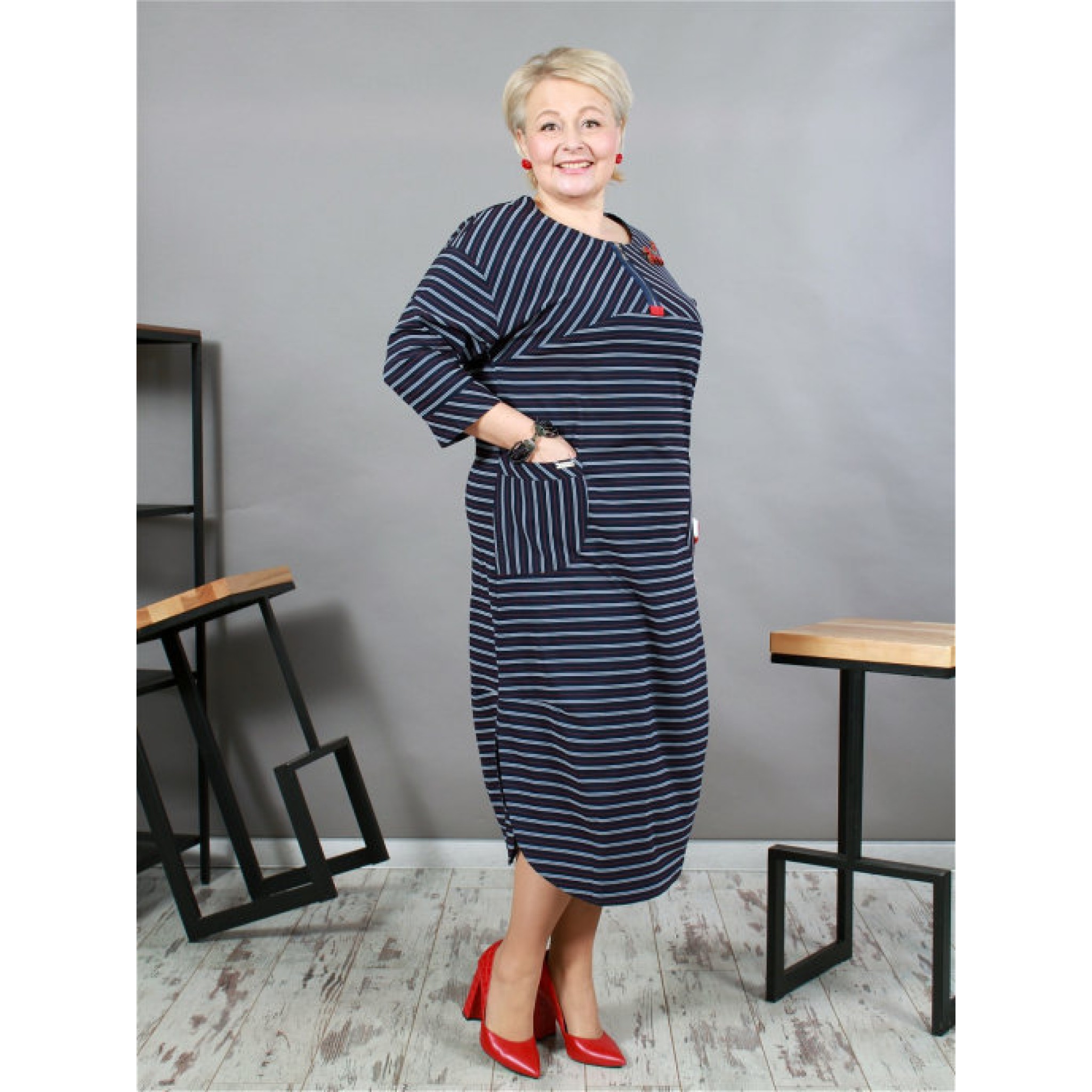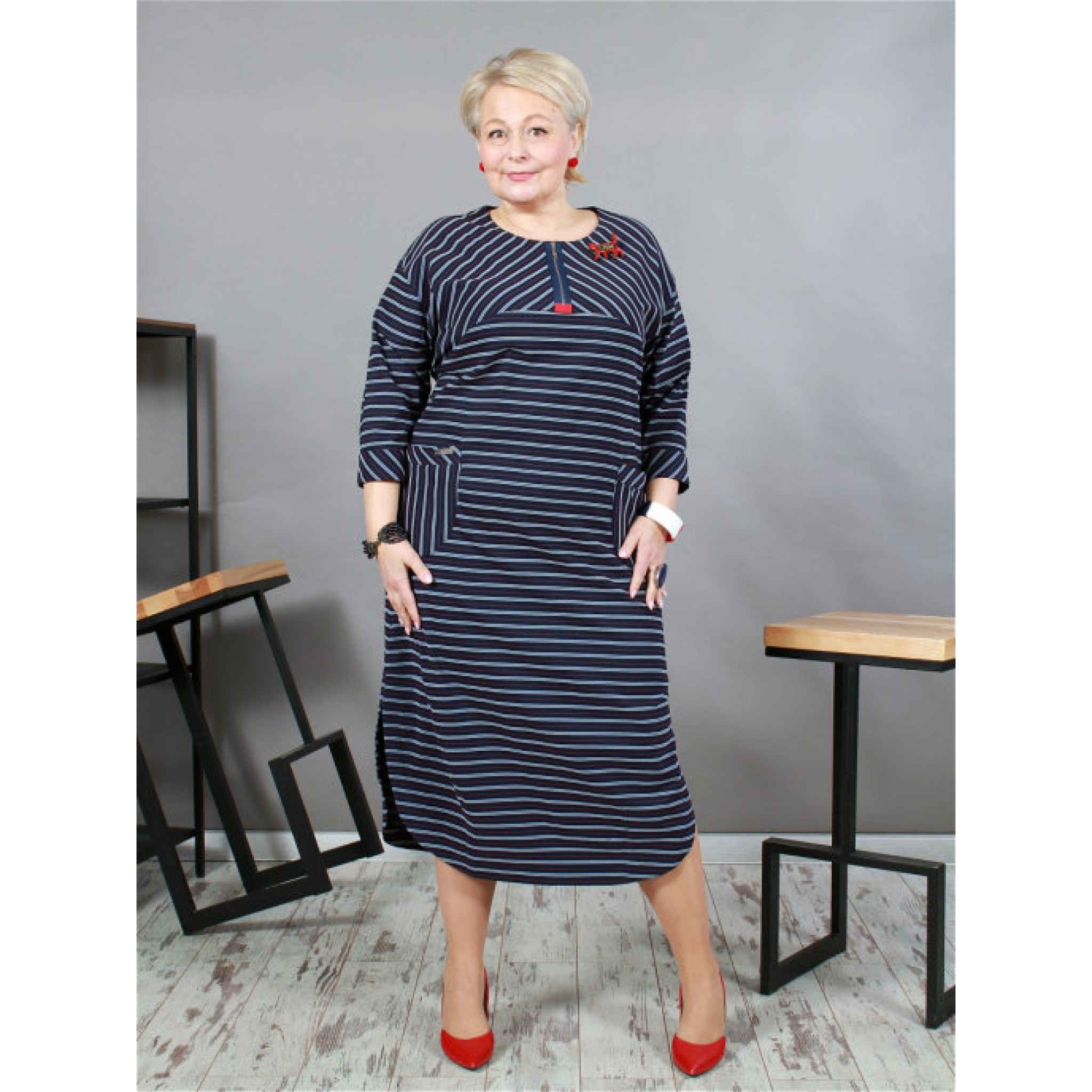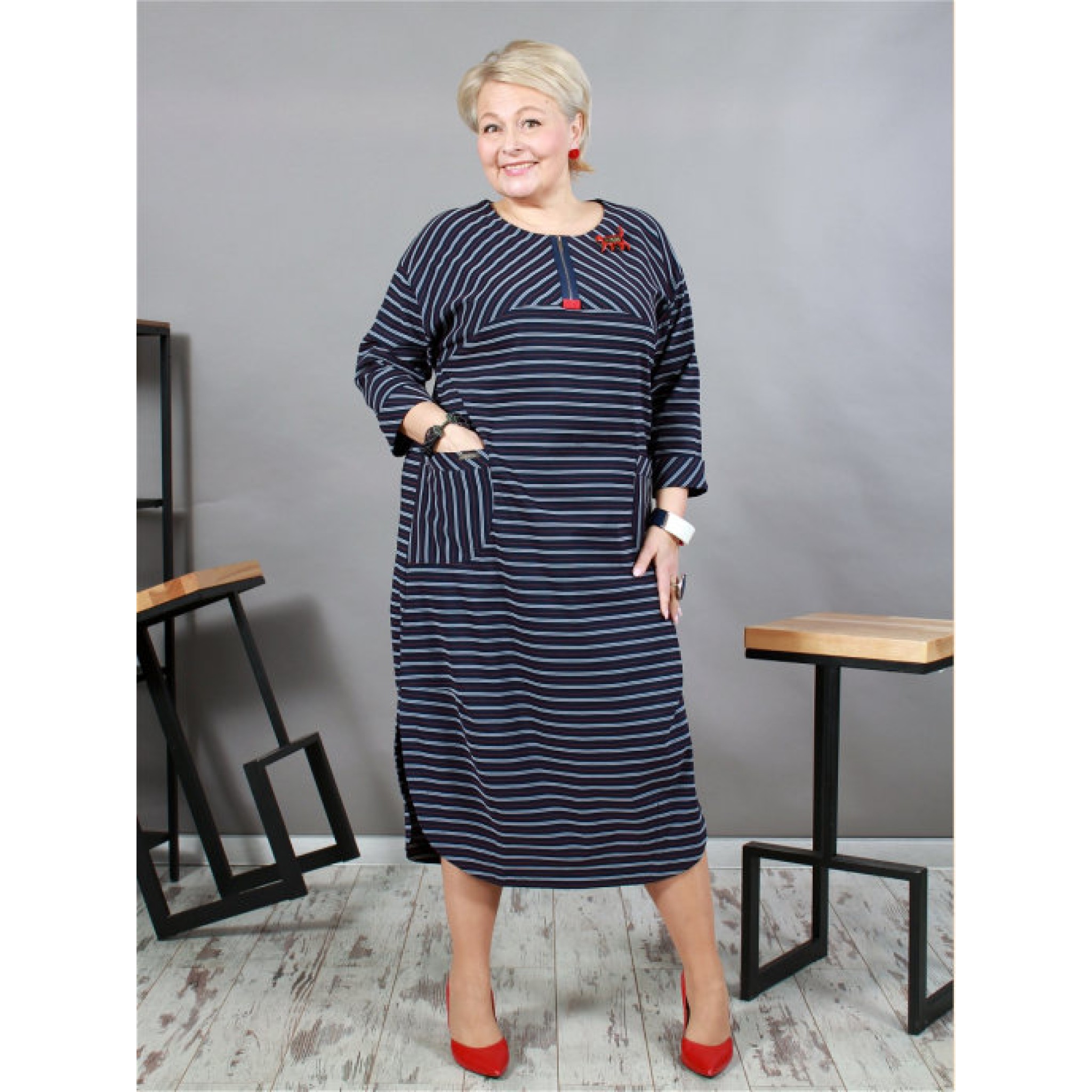 Стилісти стверджують, що підібравши для себе модне плаття в смужку, ви гарантовано будете в тренді. Наше плаття - це сучасне плаття в смужку прямого силуету, з натуральної тканини з еластаном. У сукні спущена пройма, накладні кишені, імітація застібки по горловині.