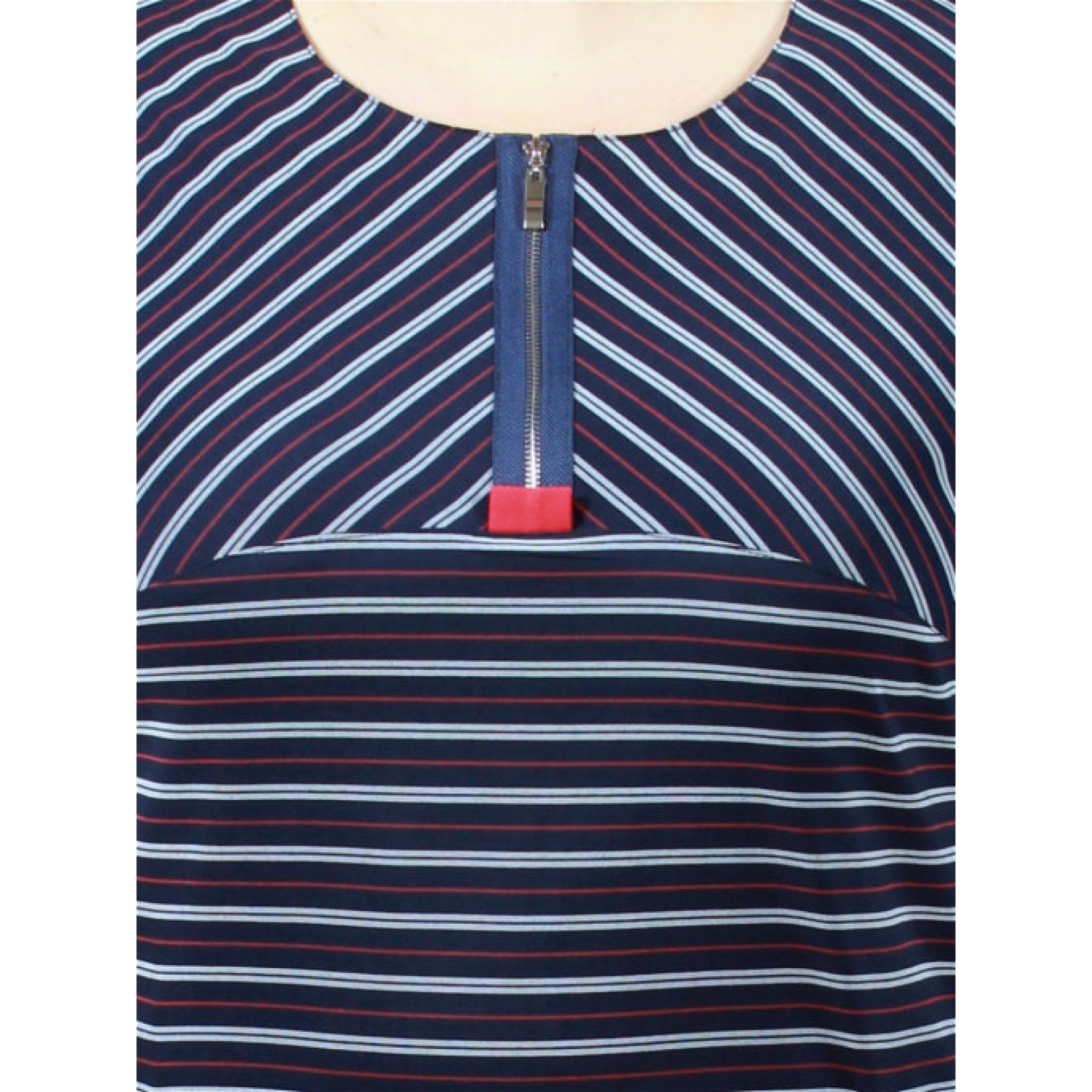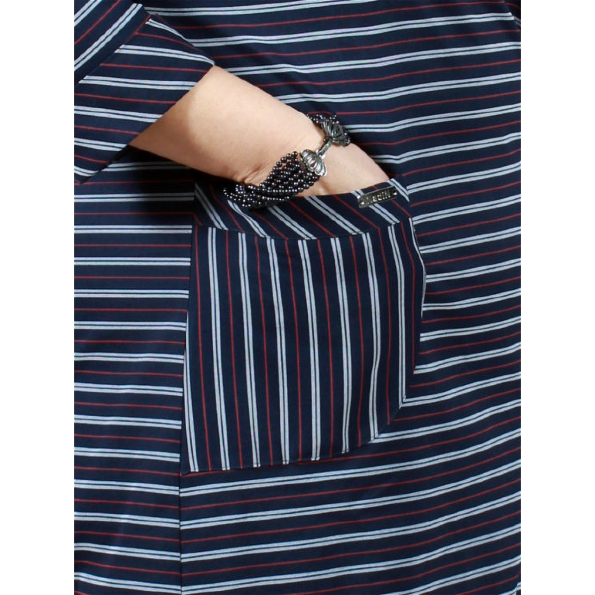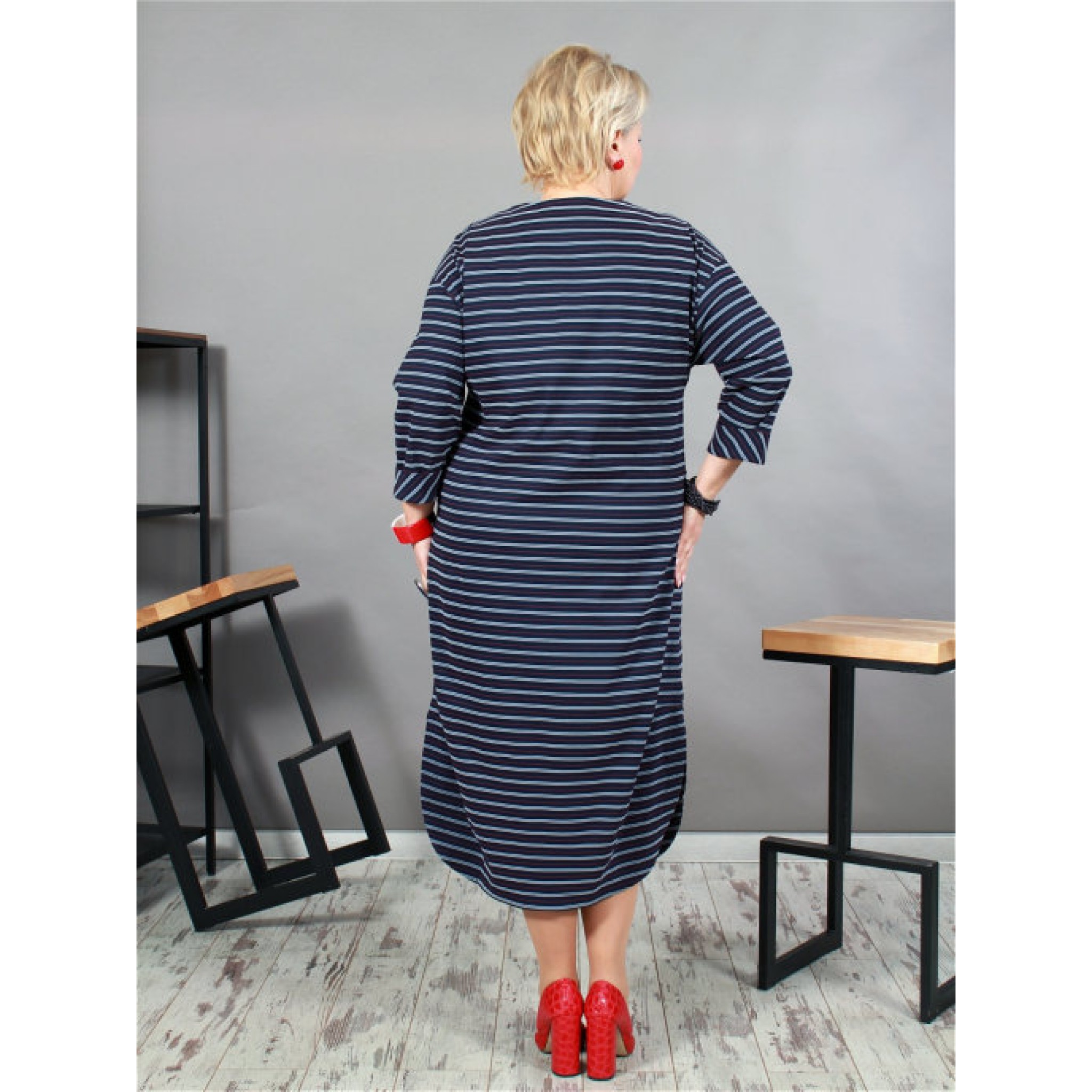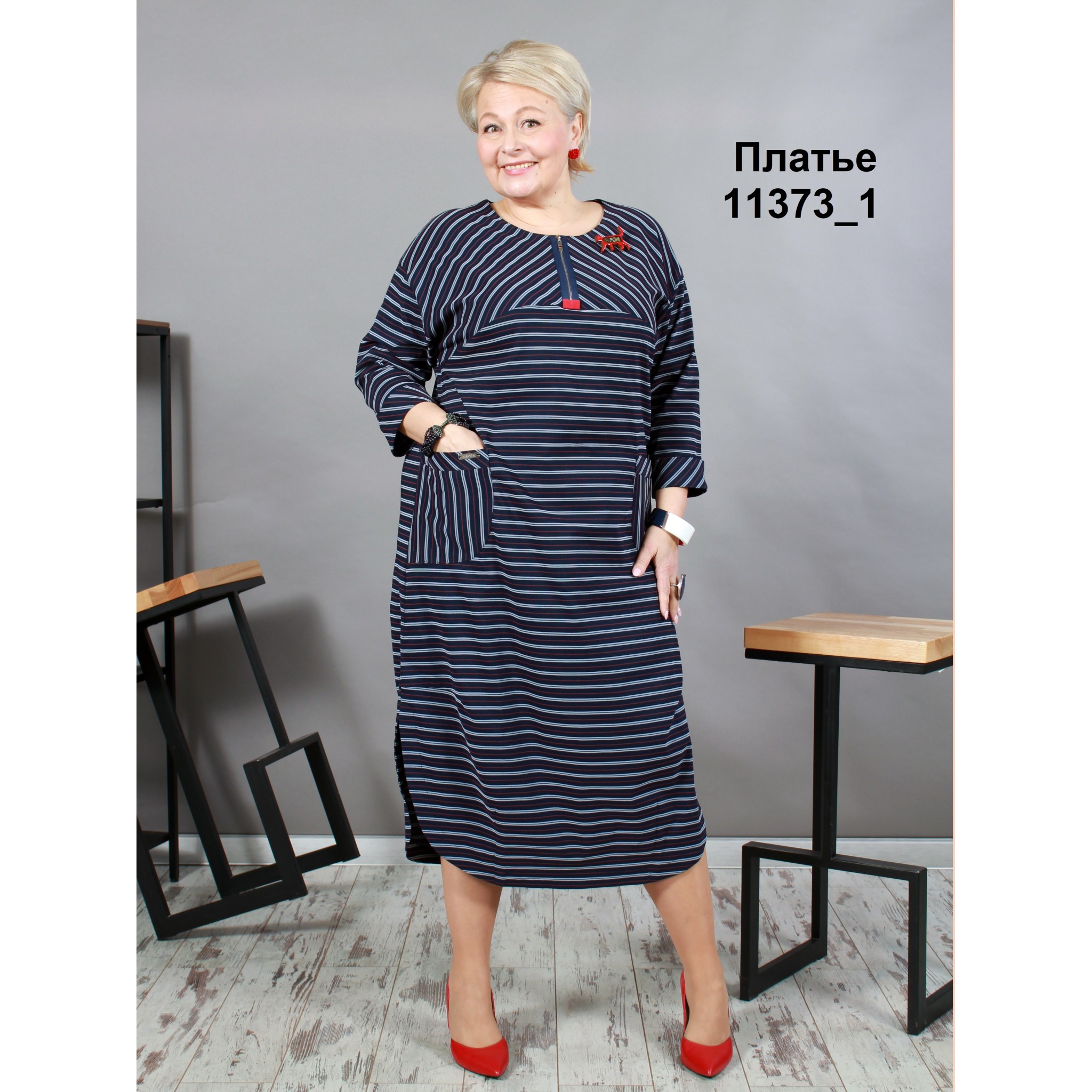 Стилісти стверджують, що підібравши для себе модне плаття в смужку, ви гарантовано будете в тренді. Наше плаття - це сучасне плаття в смужку прямого силуету, з натуральної тканини з еластаном. У сукні спущена пройма, накладні кишені, імітація застібки по горловині.